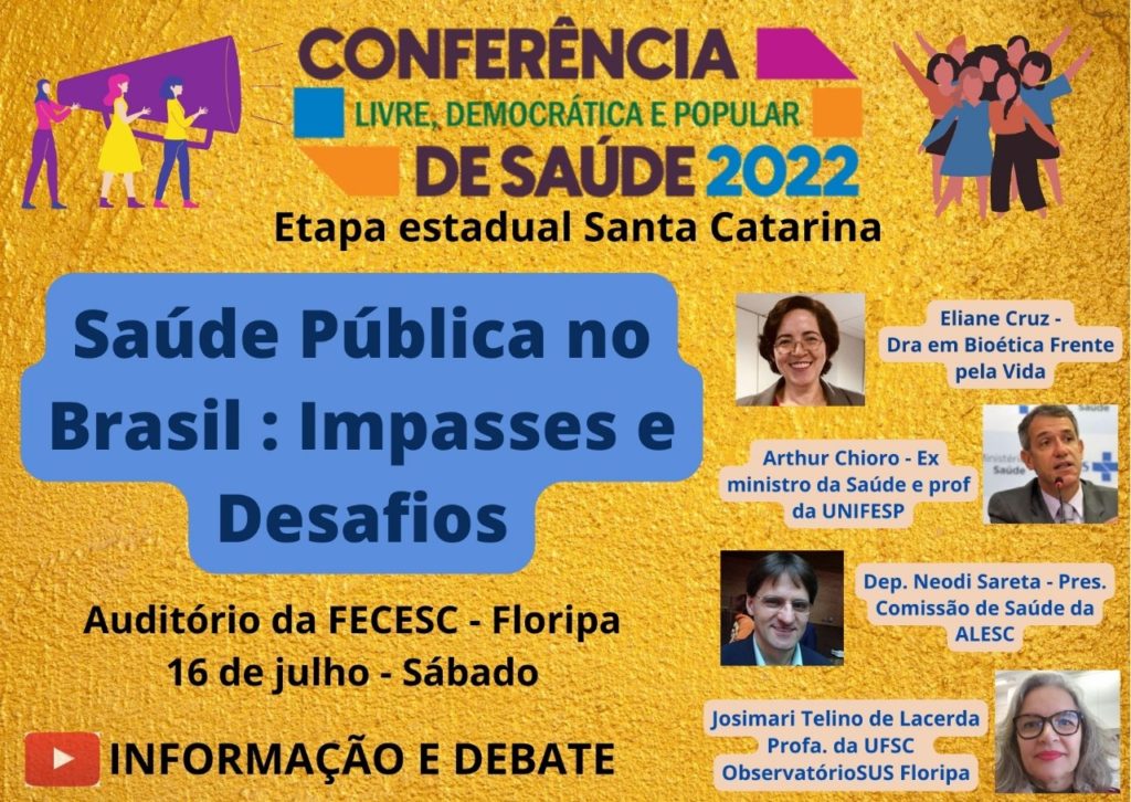 9:30-12:00 – Exposições e Debate: Saúde Pública no Brasil: resgate dos avanços dos Governos populares, impasses atuais e desafios para o Brasil e Santa Catarina.